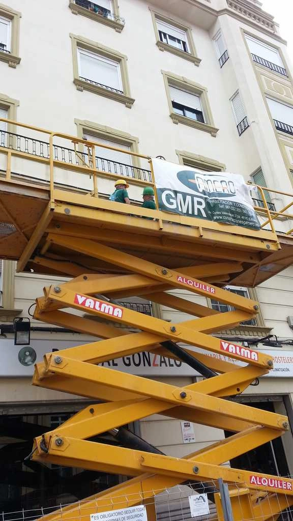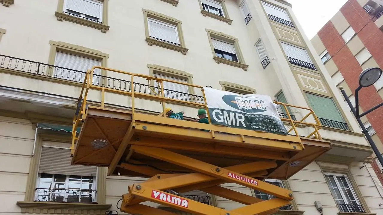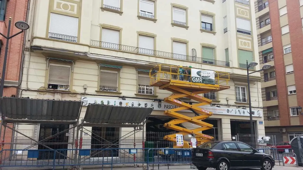 Reparación puntual de fachada, en voladizos. Este tipo de intervenciones incide en los problemas puntuales de las fachadas, que suponen un riesgo para los viandantes por caídas de cascotes a la vía pública. Las técnicas empleadas conllevan la utilización de medios auxiliares como las plataformas elevadoras y los trabajos verticales. En la vía pública también se ha instalado un desvío de peatones protegido, para evitar cualquier incidente.